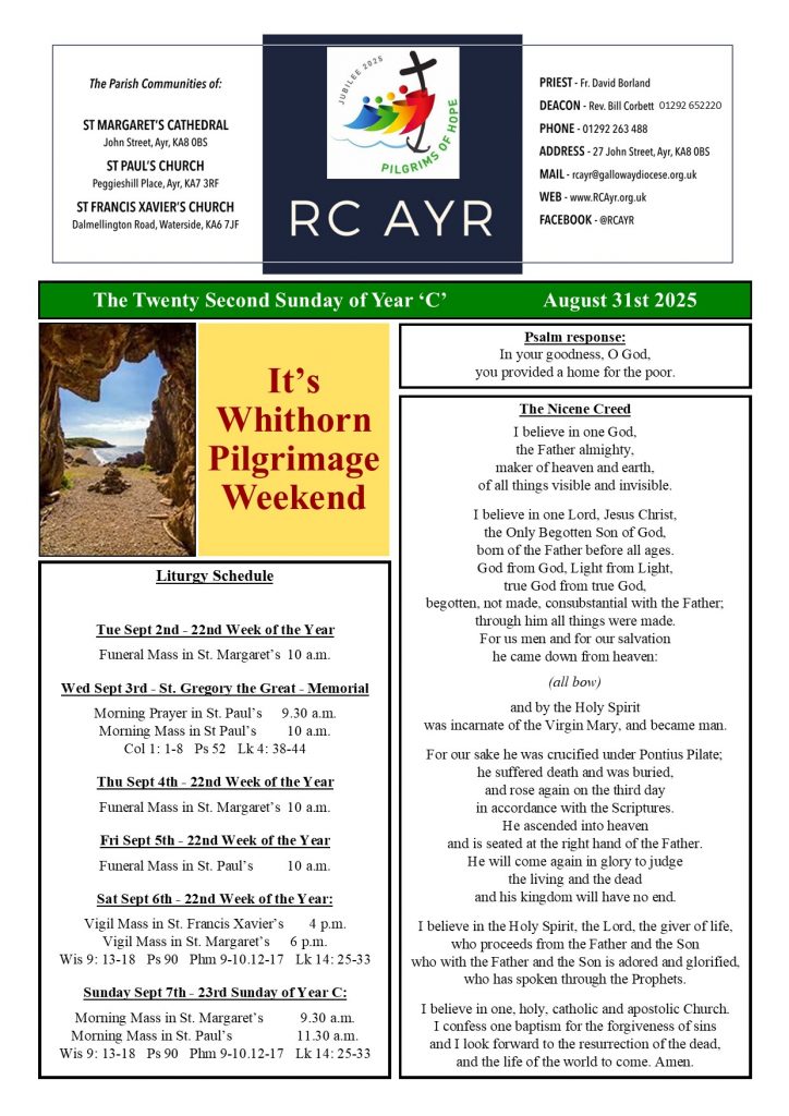 Newsletter for the 22nd Sunday of Year C, August 31st 2025